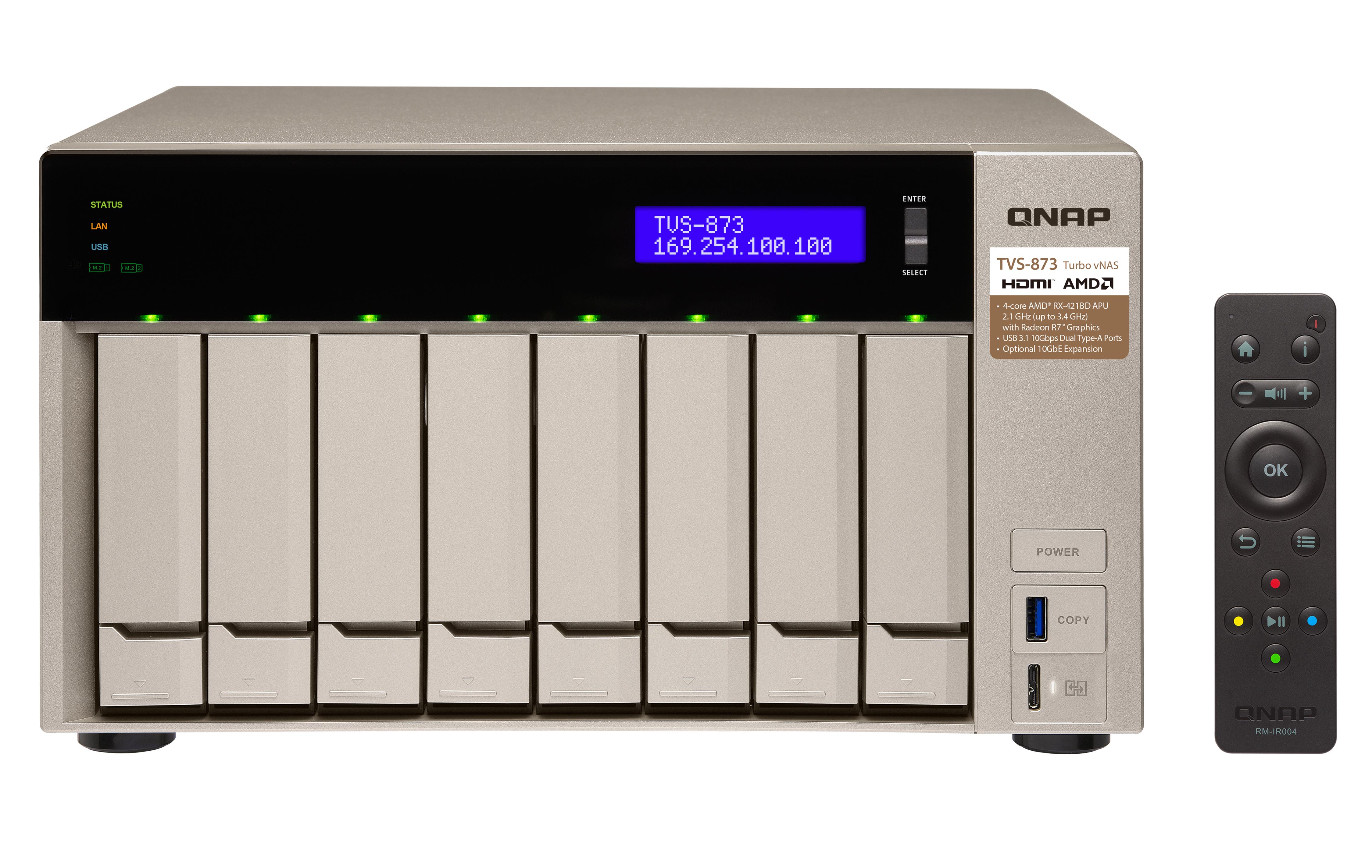 QNAP TVS-873 Tower (8-Bay) Network Attached Storage (NAS) AMD (RX-421BD) 2.1GHz 64GB (4x16GB) QTS 4.3 LAN/USB/HDMI (Gold)