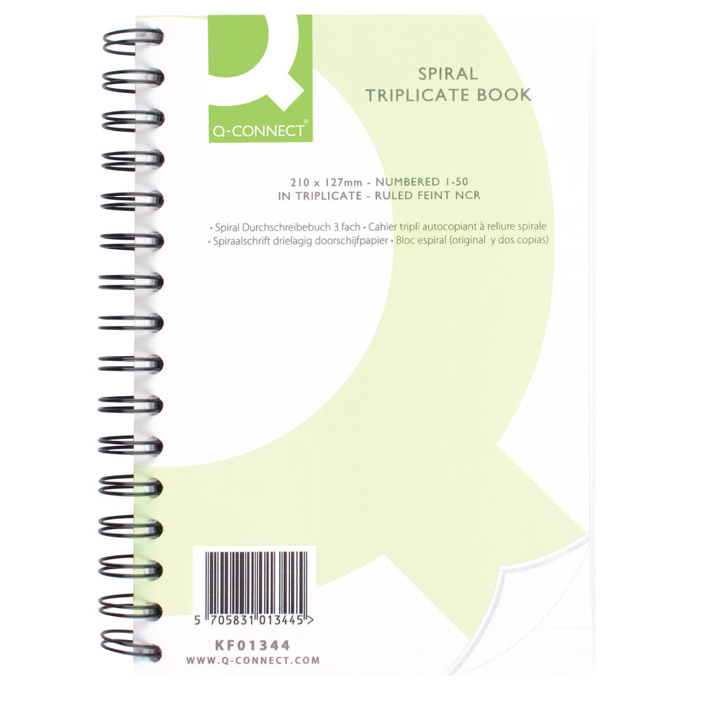 Q-Connect Spiral Bound Triplicate Book. Contains 50 carbonless sets of White, Blue and Yellow sheets, each page numbered and the top two sheets perforated. Supplied with removable index card that can be used as a writing shield between each set. 210x127mm